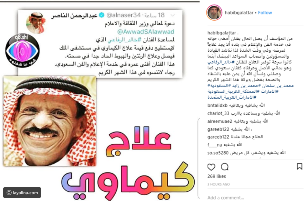وأضاف الصحفي عبد الرحمن الناصر في تغريدة عبر حسابه الخاص “تويتر” أن الفنان خالد الرفاعي يعاني من عدم قدرته على دفع تكاليف العلاج.