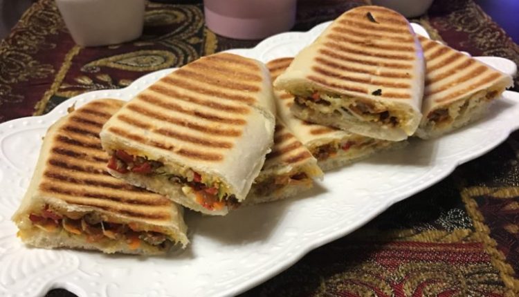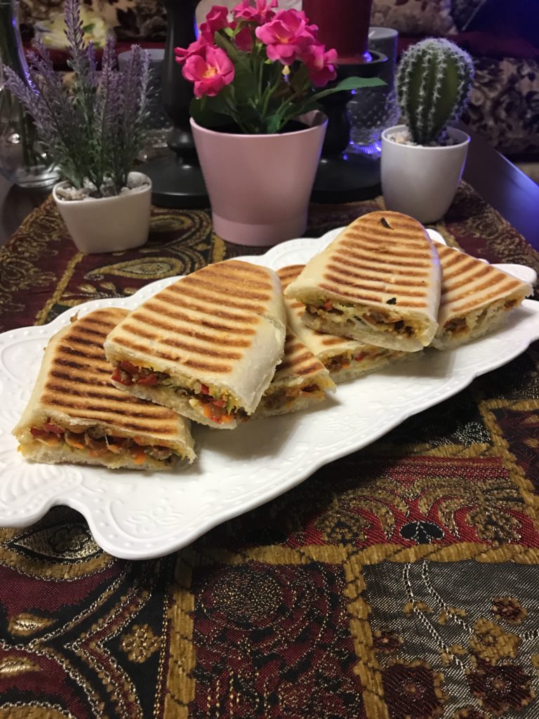 نأخد البصل مكعبات نضعه في المقلاة مع الثوم و شوية زيت زيتون والملح والابزار وسكنجبير وورقة سيدنا موسى ونحركه حتى يتحمس ويذبل، ثم نضيف عليه الفلفل الأحمر والأصفر والجزر ونرش عليهم الكمون والطحميرة والقرفة. بعدما يتحمسوا جيداً نضيف عليهم الكرعة ونضيف القرقومن ثم نضيف كأس صغير من الماء ونستمر في التحريك على نار متوسطة حتى تنشف الخضار وتتشرب وتصبح ناضجة، ثم نضيف عليها الكفتة والربيع مقطع ونبقى نحرك حتى تنضج الكفتة ونرفعها من على النار ونتركها تبرد ثم نأخد خبز البانيني نقطعه من الوسط ونملأ الجزء العلوي منه بالحشوة، لأنه أكبر حجماً من الجزء السفلي ثم نضع فوق الحشوة الجبن المبشور ونغطيه بقطعة الخبز الثانية ونصففهم في آلة البانيني وهي ساخنة ونقفلها عليهم حتى يتحمروا جيداً ثم نخرجهم ونقطعهم نصفين ونقدمهم.