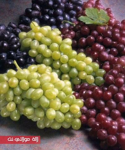يحتوي المائة غرام من العنب على 95% من وزنه ماء – 7 غرامت جلوكوز – 1 غرام دهون – 16 غرام كربوهيدرات ونصف غرام بروتين و عشرين مليغرام فيتامين سي و افضل انواع العنب كبير الحجم ولونة ابيض العنب يعتبر منشط للعضلات و الاعصاب و مجدد للخلايا وطارد للسموم من البدن و مطهر ومدر للبول ويعتبر العنب مفيد للذين يعانون من ضعف العظام و اضطرابات الدم و داء النقرس و امراض الرئة و المصابين بالروماتيزم كما يساعد العنب الجسم على اختزان المواد الآزوتية و الدهنية بالجسم فتزيد بذلك من مناعتة و مقاومتة للامراض والتعب يجب غسل العنب جيد قبل الاكل لازالة مادة سلفات النحاس التي ترش على العنب