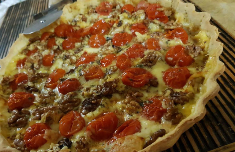 في إناء نضع الدقيق و باقي مقادر العجين يعجن بدون دلك و يوضع في الثلاجة لمدة ساعة ،يدلك بمدلك و يوضع في إناء الطبخ ، بواسطة ملعقة نسرح المطارد فوق العجين ثم الجبن ثم الطماطم المقسومة نصفين ثم الجوز .تدخل الفرن سابق التسخين على 180 درجدرجة الاسفل فقط لمدة 40 دقيقة. و بالصحة و الراحة