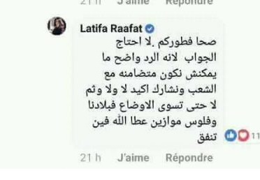 وبخصوص ردها، فقد أشارت لطيفة إلى أنها متضامنة مع الشعب وبالتالي لا يمكنها أن تشارك في موازين إلى حين تسوية الأوضاع في البلد معتبرة أن أموال هذه التظاهرة يجب أن تنفق في العديد من الأمور الهامة الأخرى.