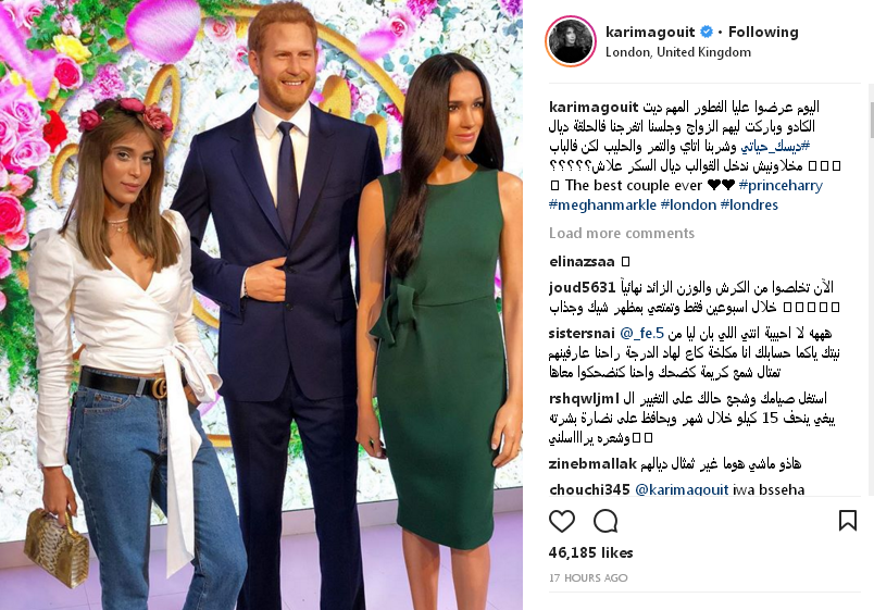 نشرت الفنانة المغربية على حسابها انستغرام صورة لها مع الامير هاري و زوجته ميغان ماركل معلقة على الصورة بشكل ملفت ومضحك.