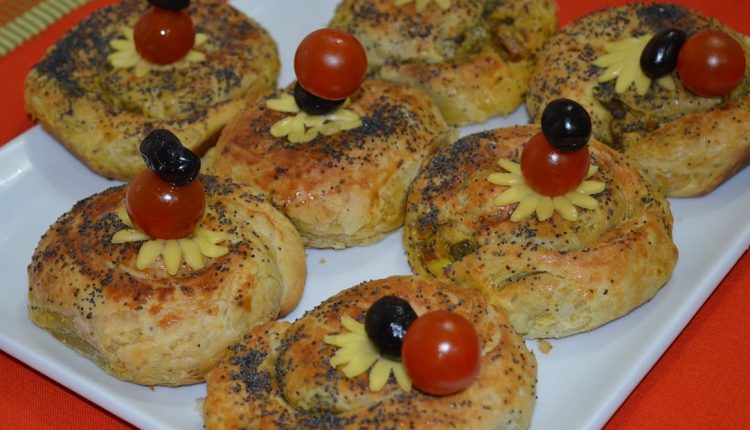 في مقلاة نضع جميع مكونات الحشو ونتركها على نار هادئة حتى تطهى  نأخذ كل كرة نبسطها على شكل دائرة ثم نضع الحشو على شكل قطر للدائرة وأخيرا نضع الجبن على الوجه وندخلها الفرن حتى تطهى وتتحمر .