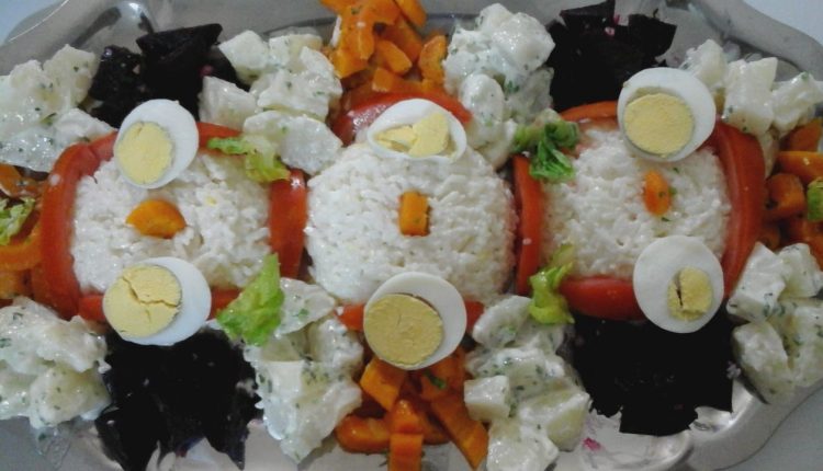 نضع خليط الارز في الزلافة و نقلبه في طبق التقديم ونقوم بتستيف الخضر.
