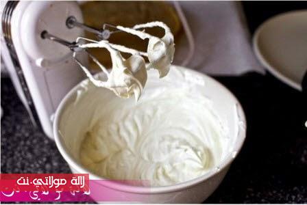 في هذه الاثناء نحضر كريمة الجوز بمزج القشدة الطرية مع الزبدة و السكر و نضعها