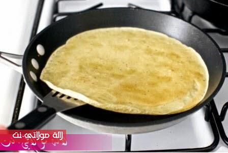 نقوم بخلط كل مكونات الكريب جيدا ثم نطبخها في مقلاة كالعادة بالحجم الذي نريد
