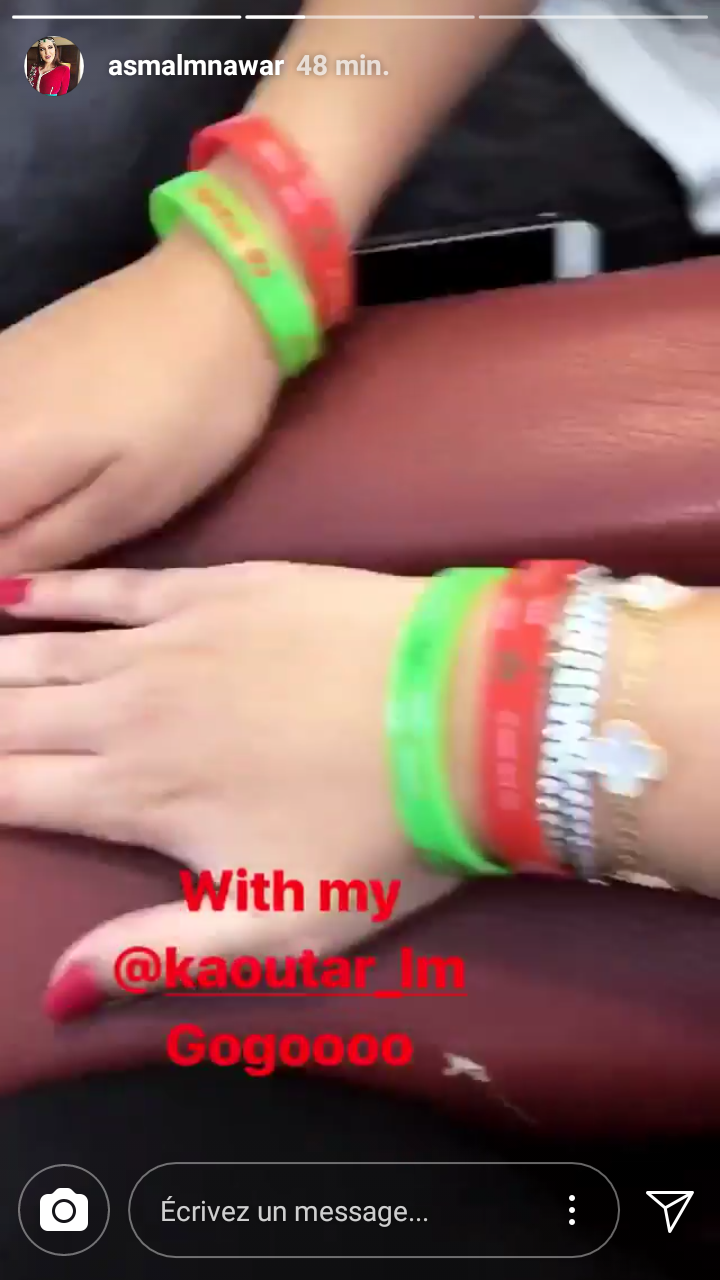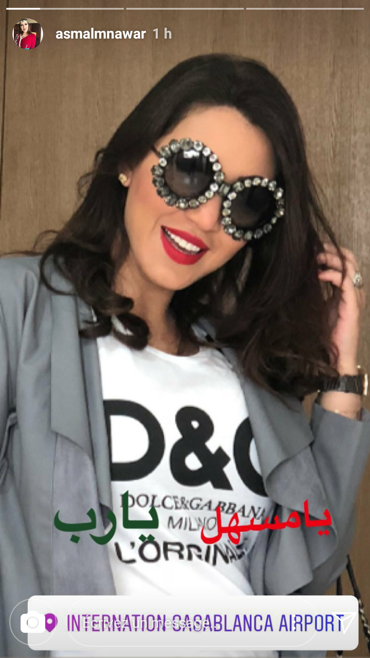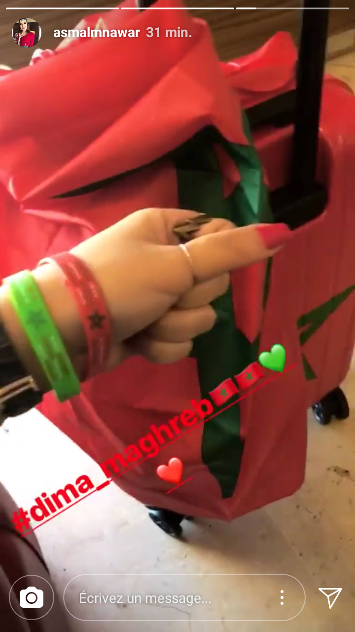 ونشرت المنور صورة لها من مطار محمد الخامس قبل رحلتها، كما كشفت عن الاكسسوارات التي وضعتها حول يديها من أجل تشجيع الفريق الوطني في موسكو.