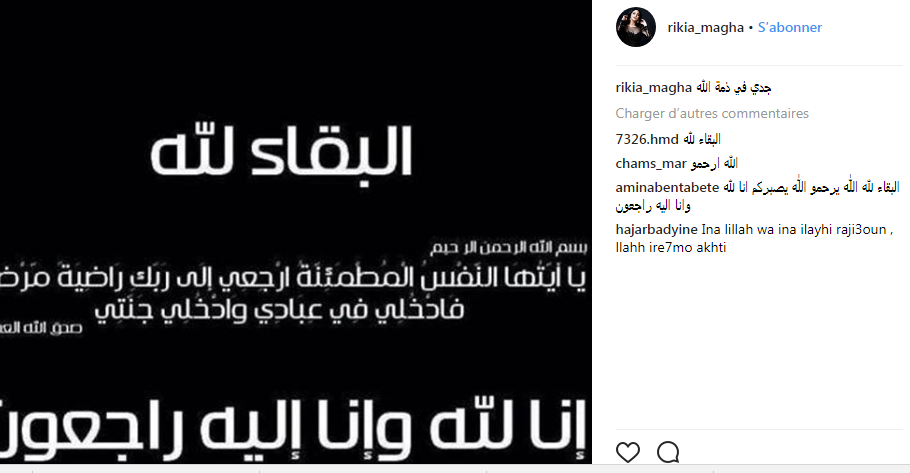 “ونشرت الفنانة المغربية صورة على الموقع المذكور علقت عليها بقولها: “جدي في ذمة الله