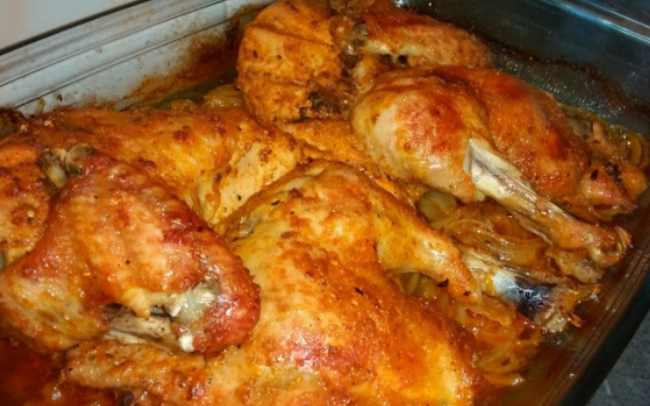 في اناء مناسب ضعي التوابل وزيت الزيتون،وتبلي قطع الدجاج جيدا،بعد ذلك توضع في المول الخاص بالفرن مع شرائح البصل،يدخل الدجاج الى الفرن لمدة 45 دقيقة ثم يقدم.
