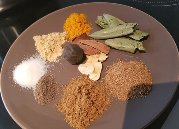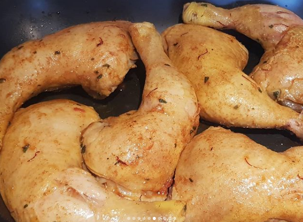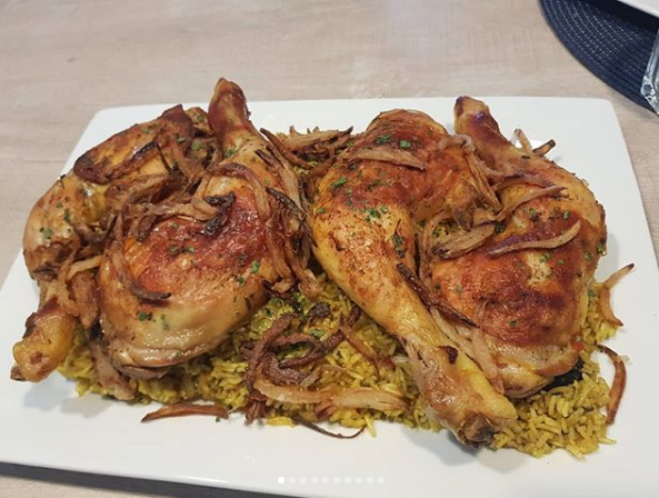 في اناء نضع 500غ من الارز البسمتي، نغطيه بالماء البارد و نتركه مدة 30 دقيقة. في طنجرة، نضع 3 بصلات مقطعة مع قليل من زيت المائدة، نضع 1,5 كلغ دجاج و نشحر الكل، نغطي الدجاج بالماء ثم نضيف 2 طماطم مقطعة، و ملعقة صغيرة من كل من القزبر يابس، توابل الشوارما، كركم، الزنجبيل، ملح و ابزار، اعواد قرفة، ثوم شرائح يابس، اوراق الغار، لومي (حامض اسود، ممكن تعويضه بربع حامض)، قزبر، نخلط الكل و نتركه يطهى مدة 20 دقيقة. نزيل الدجاج و نضعه في صينية فرن. نترك الصلصة تختر. في اناء، نضع قليل من الزعفران الحر، ملح، زيت الزيتون، فلفل احمر، نحرك جيدا ثم نذهن الدجاج و ندخله الفرن كي يتحمر.