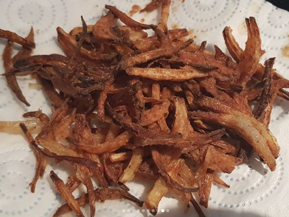 نصفي الارز و نضعه يطهى في ماء مملح. (كأس ارز×2 كؤوس ماء) و نحتفظ به جانبا. نضيف الارز على الصلصة، نغطي ثم نتركه بضع دقائق. ممكن الاحتفاظ بقليل من الصلصة الى بغيتو الارز فازك شوية ( كبحال الفيديو، انا هكداك خليت الصلصة) و الى حبيتو الارز يابس، زيدو ختروها. نأخد بصلة واحدة، نقطعها (شكل هلالي)، نمررها في دقيق متبل بالملح و الابزار ثم نقليها في حمام زيت ساخن. نخلط جيدا الارز و الصلصة، نضع في صحن التقديم، نضع الدجاج المحمر و نزين بالبصل المقلي.
