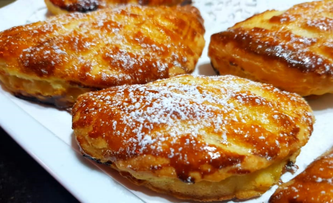 نأخذ العجين المورق و نقطعه دوائر بالمرشم ، ندهن نصف دائرة بالبيض و نضع كمية ديال التفاح اللي حضرنا و تجمع على شكل هلال و تدهن بالبيض و ندخلها للفرن و تقدم بالصحة و الراحة.