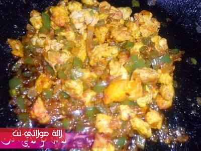 في مقلات نخلط كل قطع ديك رومي او دجاج + البصلة + فلفلة + توابل ( ملح _فلفل اسود_ _ زعفران )+ الزيت