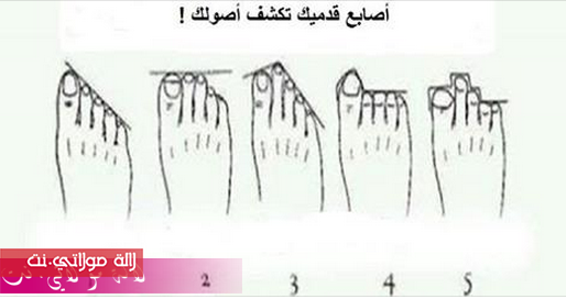 وتشير صورة القدم الأولى إلى أن من يملك مثل هذا الشكل للقدم فإن أصوله عربية، بينما مثل الشكل الثاني والذي يكون فيه الاصبع الثاني والثالث بطول الاصبع الأول قدم من أصولهم رومانية، أما الثالث فكان لأصحاب الأصول اليونانية وتميز بطول الاصبع الثاني مقارنة بالاصبع الكبير، فيما كان الاصبع الكبير هو الأطول في أقدام ذوي الأصول الجرمانية والتي تعني ” الألمانية”.