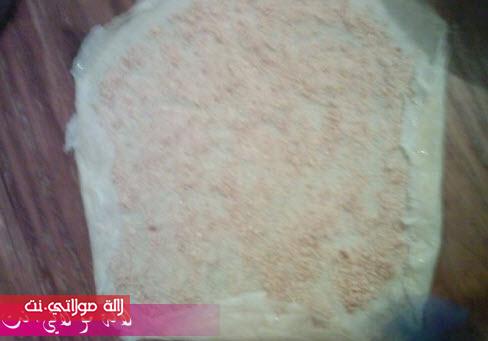 نأخذ 2 ورقات ديال البسطيلة وحدة فوق وحدة و ندهن الفوقانية بالزبدة ونرش قياس 2 معالق كبار من خليط اللوز