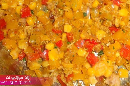 للحشوة :1 بصلة + فلفلة ألوان حسب المتوفر عندنا +علبة طن وشوية درة معلبة+ نصف كنور وملح وإبزار وقزبر