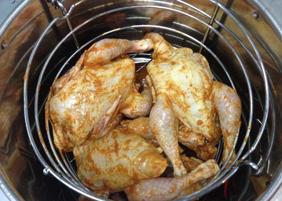 نغسل قطع الدجاج ونقوم بعمل شقوق غائرة في الدجاج لتسهيل وصول التتبيلة إلى داخل قطع الدجاج. نضع جميع المكونات السابقة في وعاء الخلاط ونضربها جيداً حتى تختلط جميع ببعضها ويصبح خليطاً ناعماً، تضاف التتبيلة إلى قطع الدجاج وتوضع في الثلاجة لمدّة يوم كامل أو قبل الشواء بست ساعات على الأقل.