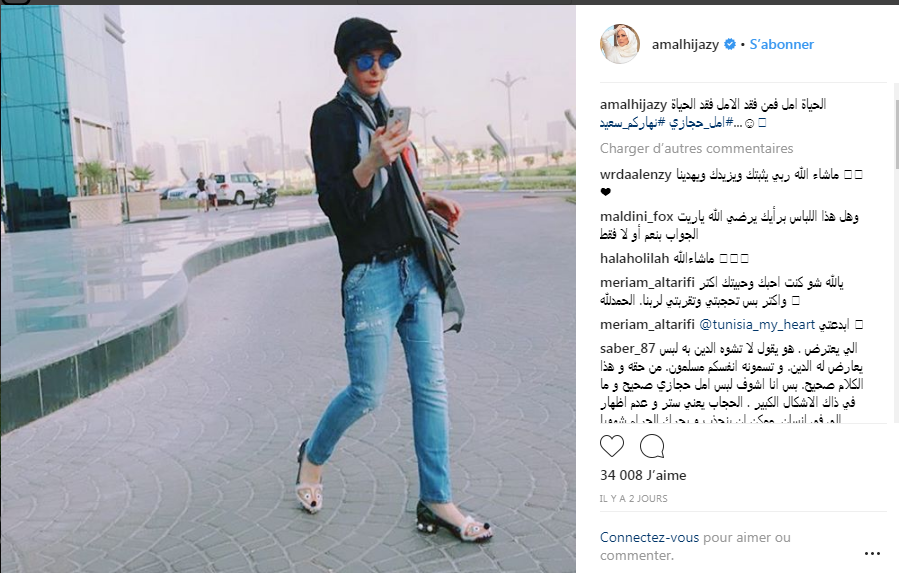 وفي آخر صورة نشرتها النجمة المحجبة، ارتدت فيها بنطال من الجينز وقميص أسود اللون، وقامت بتغطية رأسها بقبعة بنفس اللون، وأرفقتها بتعليق “الحياة امل فمن فقد الامل فقد الحياة..أمل حجازي..نهاركم سعيد”. أثارت جدلا كبيرا في صفوف متابعيها الذين اعتبروا أنها تخلت عن الزي المحتشم، وارتدت جينز ضيق.