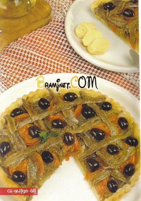 تسرب البصل فوق الطارطا وترص فوقها دوائر الطماطم المقطعة دوائر رقيقة ثم يوضع فوقها شرائح لانشون والطماطم الجافة على شكل طولي ونزين بالزيتون ثم تطهى فوقها لمدى 30دقيقة.