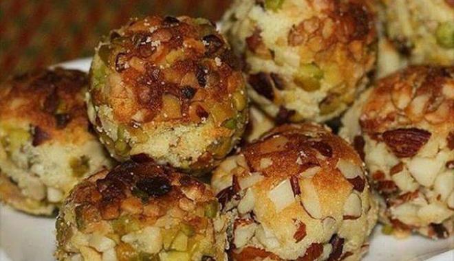 الحشوة : نشكل العجينة إلى دوائر صغيرة ونحشيها بالتمر ثم نزيّنها بالمكسرات او بحبّات الفاكهة المجفّفة. نضها في قالب و ندخلها للفرن على حرارة متوسّطة، مدة نصف ساعة. ثم تترك الصينية حتى تبرد، وتقدم باردة.