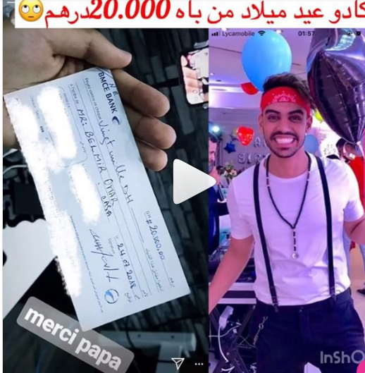 نشر الفنان المغربي الشاب عمر بلمير مقطع فيديو يظهر فيه تلقيه هدية خاصة من والده بمناسبة عيد ميلاده، بعد قيامه بتحدي رفقته مباشرة على تطبيق”لوبس” يوم الثلاثاء الماضي. وظهر عمر بلمير في مقطع فيديو، وهو يتلقى من والده شيك بنكي يبلغ رصيده 20 ألف درهم، وبدت الفرحة عليه حيث علق قائلا:”شكرا أبي”.