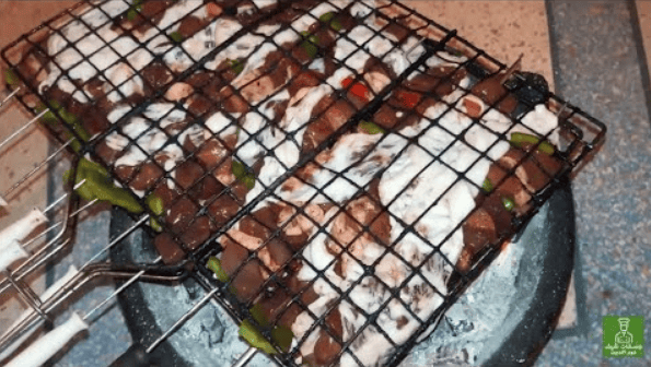 قومي بتتبي الكبد بالملح و الكمون و الفلفل اسود ثم قومي برص الكبد و الخضر في اسياخ الشواء ثم الشحم و نقوم بشيها