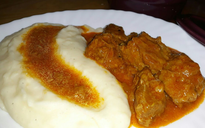 ونقليها ثم نضيف ملعقة صغيرة طماطم مصبرة ونمرق بكأس ماء سخون ونغلق