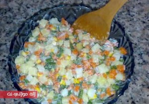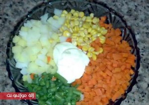 نضع الخضر المسلوقة في إناء، نضيف إليها نصف كمية حبوب الذرة وملعقتين كبيرتين من صلصة المايونيز