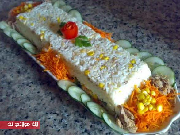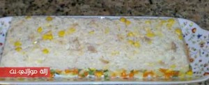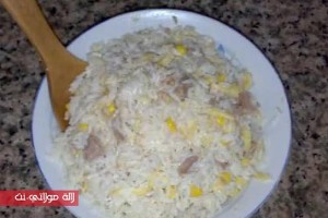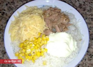 نسلق الأرز في ماء مملح ونصفيه ونحتفظ به جانبا حتى يستقطر جيدا ثم نضعه في إناء، نضيف له 3 ملاعق كبيرة من صلصة المايونيز، الجبن المفروم، وباقي حبوب الذرة وسمك الطون.