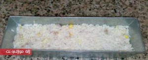 نفرغ خليط الأرز في آنية مستطيلة الشكل ونبسطه جيدا بالملعقة.