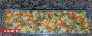 نفرغ خليط الخضر فوق خليط الأرز، نبسطه جيدا بالملعقة، ثم ندخل الآنية إلى الثلاجة لنصف ساعة تقريبا.