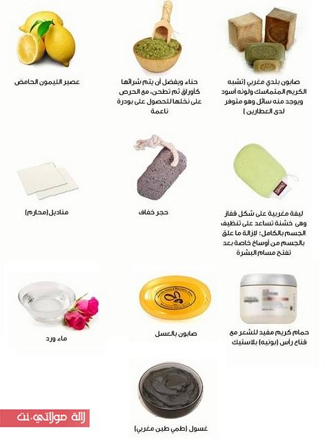 • تنظيف الجسم بالماء الساخن جيداً ثم فركه باللوفة المغربية (من الأسفل إلى الأعلى باتجاه القلب لتنشيط الدورة الدموية)، من خلال البدء بالوجه ثم العنق فالصدر والبطن ثم اليدين والقدمين، وكذلك الوضع بالنسبة للظهر.