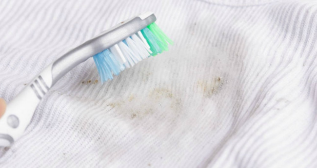 ضعي بودرة الأطفال أو النشا أو الملح اتركيها قليلا وبعد ذلك ازيليهم , ضعي المنظف على البقعة افركيها قليلا بفرشاة واغسليها بشكل عادي