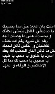 وقالت مريم “آمنت بأنّ العين حق ممّا يصيبك يا صديقي، فالكل يتمنى مكانك، ويحسدك على ما وصلت إليه. رغم كل الأشياء رغم أنك خلف القضبان، والناس تأكل لحمك مثلما تأكل