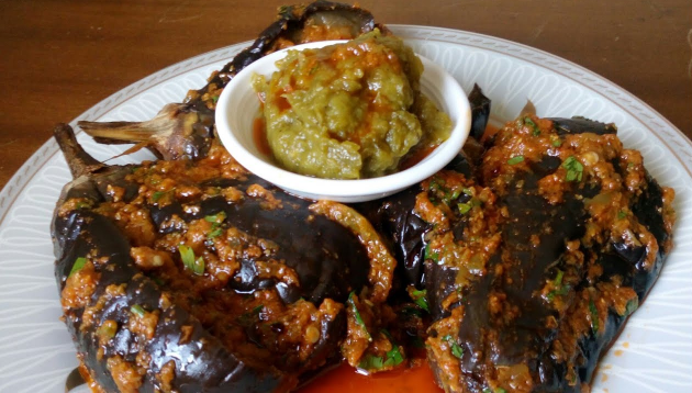 يخلط الكل ونحشو به البذنجان ونصب باقي الخليط فوقه يوضع في وعاء محكم الاغلاق ويترك في الثلاجة تدوم مدة صلاحيته حتى 15 يوم