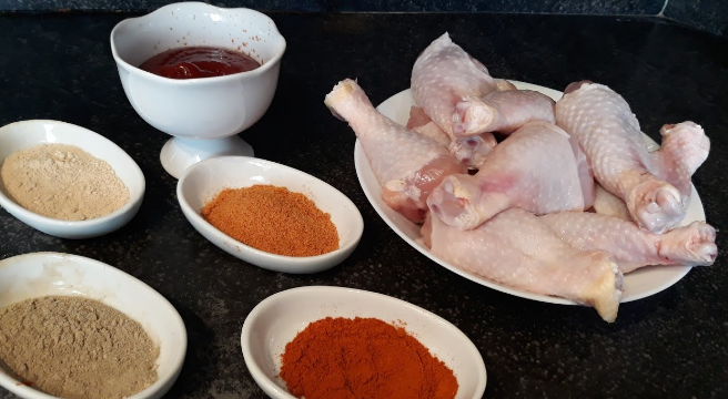 في اناء مناسب ضعي التوابل وافخاذ الدجاج وقمي بتحريكها جيدا حتى تتشرب افخاذ الدجاج التوابل جيدا،اتركيها في الثلاجة لمدة ساعتين.
