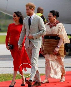 و تعرضت ميغان من خلال هاته الاطلالة للإحراج بعد ظهور إشارة الماركة البيضاء المنسدلة من أسفل الفستان الأحمر والتي تظهر أنها ترتديه للمرة الأولى.