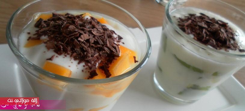 في كؤوس التقديم نضع طبقة من الياغورت و القليل من العسل ثم المانجو و الياغورت و العسل و كيوي و نزين في الاخير بالشكلاط محكوك