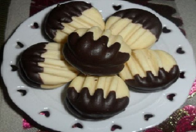 دهني يديك بشوية الزيت وبداي تاحذي كرات صغار وخودي فورشيطة غمسيها في دقيق و ضغطي بها على الكرة وضعيها في لاطة ودخليها الفرن ومنين تخرج غمسي نصف فيها في الشكلاط وخليه يجمد وبالصحة والراحة