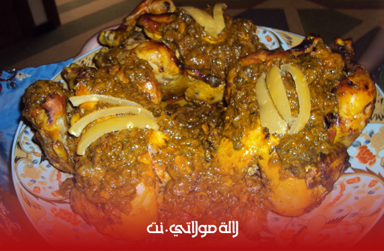 – نحضرالخلطة التي سيدهن بها الدجاج بمزج الخردل أو الموتارد، سمن مغربي، لب حامض مصير مغربي، مكعب دجاج، زعفران شعرة، ملح، زنجبيل أو سكنجبير، فلفل أسود، مركز طماطم