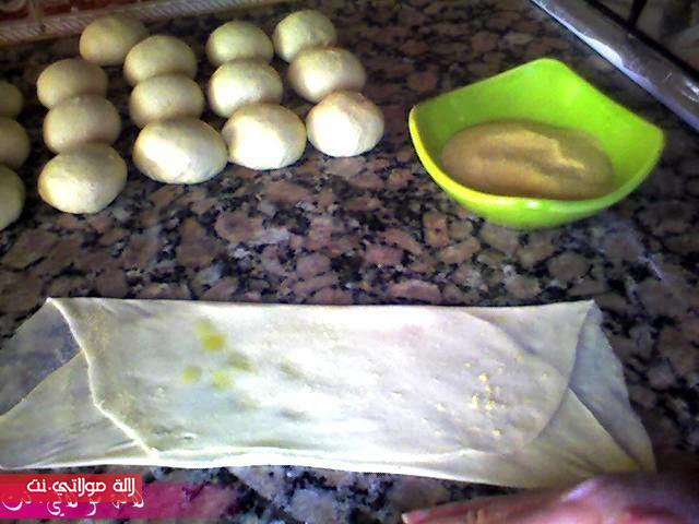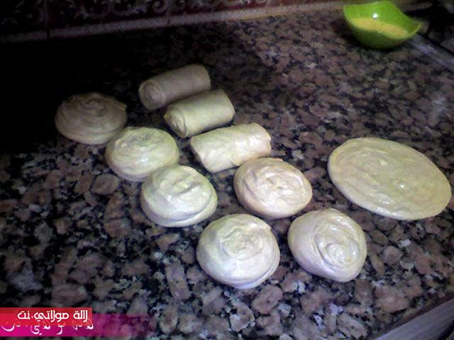 نخلطو المقادير مع بعضها حتى نحصلو على عجينة متماسكة نخليوها ترتاح شوية ثم نشكلوهم كويرات نسرحو الكرة الأولى ونورقوها بالزيت والزبدة ونرشو عليها السميدة ونطويوها كما في الصورة
