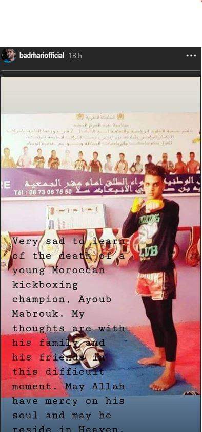 تأسف البطل العالمي بدر هاري عن استيائه لما وقع للشاب المغربي أيوب مبروك، بطل المغرب 3 مرات في رياضة “الكيك بوكسينغ”، والذي لقي مصرعه بعد غرق أحد قوارب الموت المخصصة للهجرة السرية في اتجاه اسبانيا.