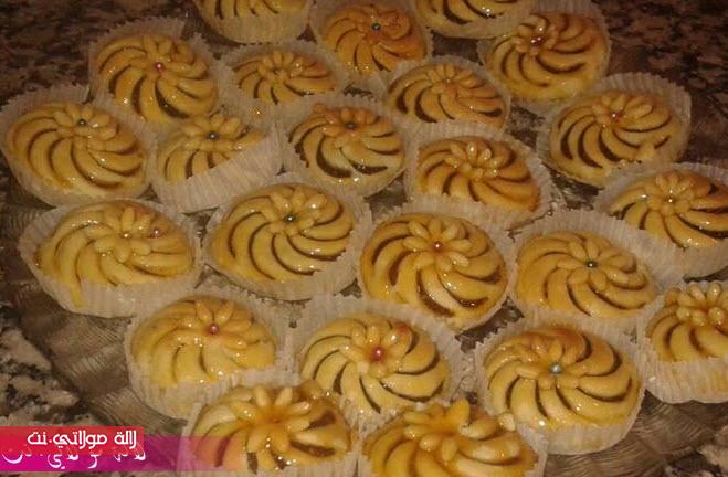 نجمع جميع مكونات العجين لنحصل عى عجينة رطبة نطلقوها بالمدلك ونقطع دوائر نعمل وسط هده الدوائر كويرات التمر نجمع الكويرة ونبسطها مثل ما في الصورة ندخلها الفرن وندهنها بالعسل