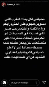 ووجهت فطيم رسالة إعتذار من خلال تدوينة لها غبر حسابها الخاص إنستغرام في تدوينة لها كتبتها في “ستوري” قالت فيها “تحياتي لكل بنات المغرب لي مسوين هجوم علي أحترم رأيكم وراح أتقبله وأخده برحب صدر الي قصدته في البسيطات هو أنكم متواضعات ومحترمات غير متصنعات لكن يمكن عندكم كلمة بسيطة معناها غير لا أعلم”.