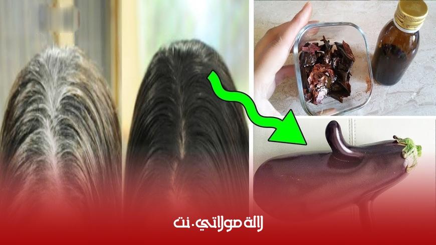 ضعي قشور الباذنجان في اناء به ماء وضعيه على النار الى درجة الغليان ثم اضيفي الشاي الاسود واتركيه 10 دقائق ثم ازيلي الاناء واتركيه الى ان يبرد ثم صفي الخليط وقومي بوضعه على شعرك من الجذور الى الاطراف لمدة 10 ايام ثم اشطفي وستلاحظين الفرق من اول اسبوع.