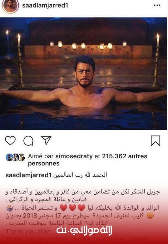 فعلق سعد لمجرد على صورته كاتبا: “الحمد لله رب العالمين .. جزيل الشكر لكل من تضامن معي من فانز وإعلاميين وأصدقاء وفنانين وعائلة المجرد و الركراكي ...الوالد والوالدة الله يخليكم ليا وتستمر الحياة”.