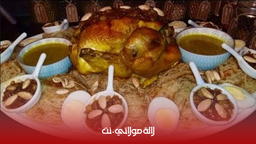 ثم توضع في طبق التقديم وتسقى بالمرق وتوضع قطع الدجاج في الوسط و تزين بالبيض المصلوق و اللوز أو حسب الرغبة