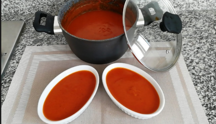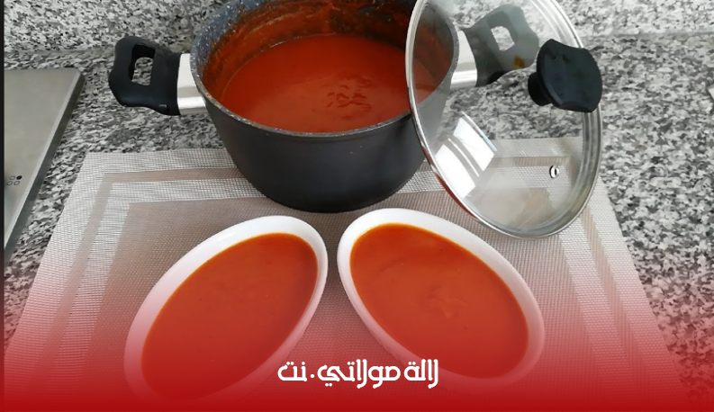 بعدها نضع الخليط في طنجرة على النار ونضيف له زيت الزيتون والتوابل الأخرى ، نغطي الطنجرة ونترك الصلصة لتطهى مدة 20 دقيقية على نار هادئة مع التقليب من حين لآخر ، وبعدها نضيف النشا ونحرك جيدا إلى أن تبدأ الصلصة بالغليان ، ثم نرفعها من على النار ونضيف لها الزعتر ونتركها جانبا لتبرد .