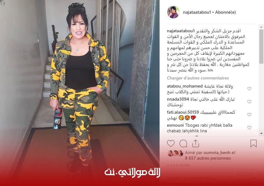 نشرت الفنانة نجاة عتابو صورة على حسابها على انستغرام، مرتدية الزي العسكري، أرفقتها بتدوينة إشادة، جاء فيها: “أقدم جزيل الشكر والتقدير المرفق بالامتنان لجميع رجال الأمن والقوات المساعدة والدرك الملكي على حسن تدبيرهم لمهامهم ومجهوداتهم الكبيرة لإيقاف كل من المجرمين والمفسدين اللي ضروا بلادنا وضرونا حتى حنا كمواطنين مغاربة. الله يحفظ بلادنا من كل شر وسوء والله ينصر سيدنا”.
