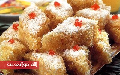 < يخلط البيض مع السكر والكوك والحليب والسميدة والفاني والخميرة الكيماوية ويوضع الخليط في صينية دائرية مدهونة بالطحينة ويترك جانبا ليرتاح لمدة ساعة.